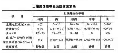 土壤腐蝕影響影響著土壤的電阻率,因此在選址時(shí)應(yīng)適當(dāng)考慮土壤腐蝕性與電阻率的關(guān)系,土壤腐蝕性等級(jí)及防腐要求如下表。
