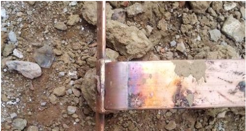 銅導(dǎo)線與銅帶搭接長(zhǎng)度應(yīng)至少20毫米;幾塊接地體(銅板)之間的連接也應(yīng)搭接銅焊,銅板的搭接長(zhǎng)度至少為50毫米,并進(jìn)行兩面焊接。焊縫應(yīng)平整、飽滿,無明顯氣孔及缺陷,焊接處的焊渣必須清除。